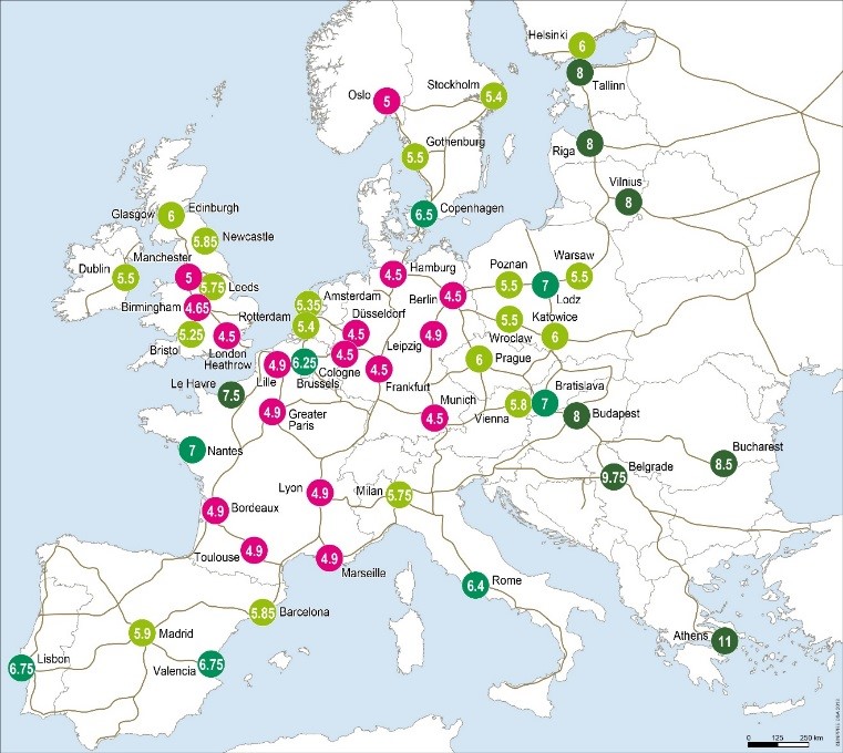 Net prime yields in 2017 – Warehouses over 5,000 sqm