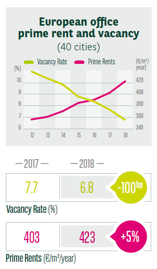Vacancy shrunk again across Europe in 2018 and may have reached its floor in several markets. The lowest vacancy rates were seen in Germany, especially Berlin (1.7%, representing only 327,000 m² of immediately available office supply) and Munich (2.3%). With only 3.7% of empty office, Luxembourg is close to the level of German markets. The most impressive drop in vacancy was seen in Amsterdam (-310 bps) and Warsaw (-340 bps). In the meantime, the share of empty premises fell in all the other main markets, such as Central Paris (-100 bps), Central London (-120 bps), Milan (-110 bps) and Dublin (-170 bps).
