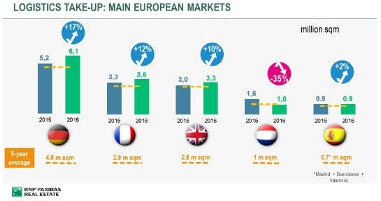 In the UK, the market picked up in 2016. Take-up increased by 10% to reach 3.3 million sqm and the shortage of supply of big boxes has been offset for the first time in years by speculative developments.