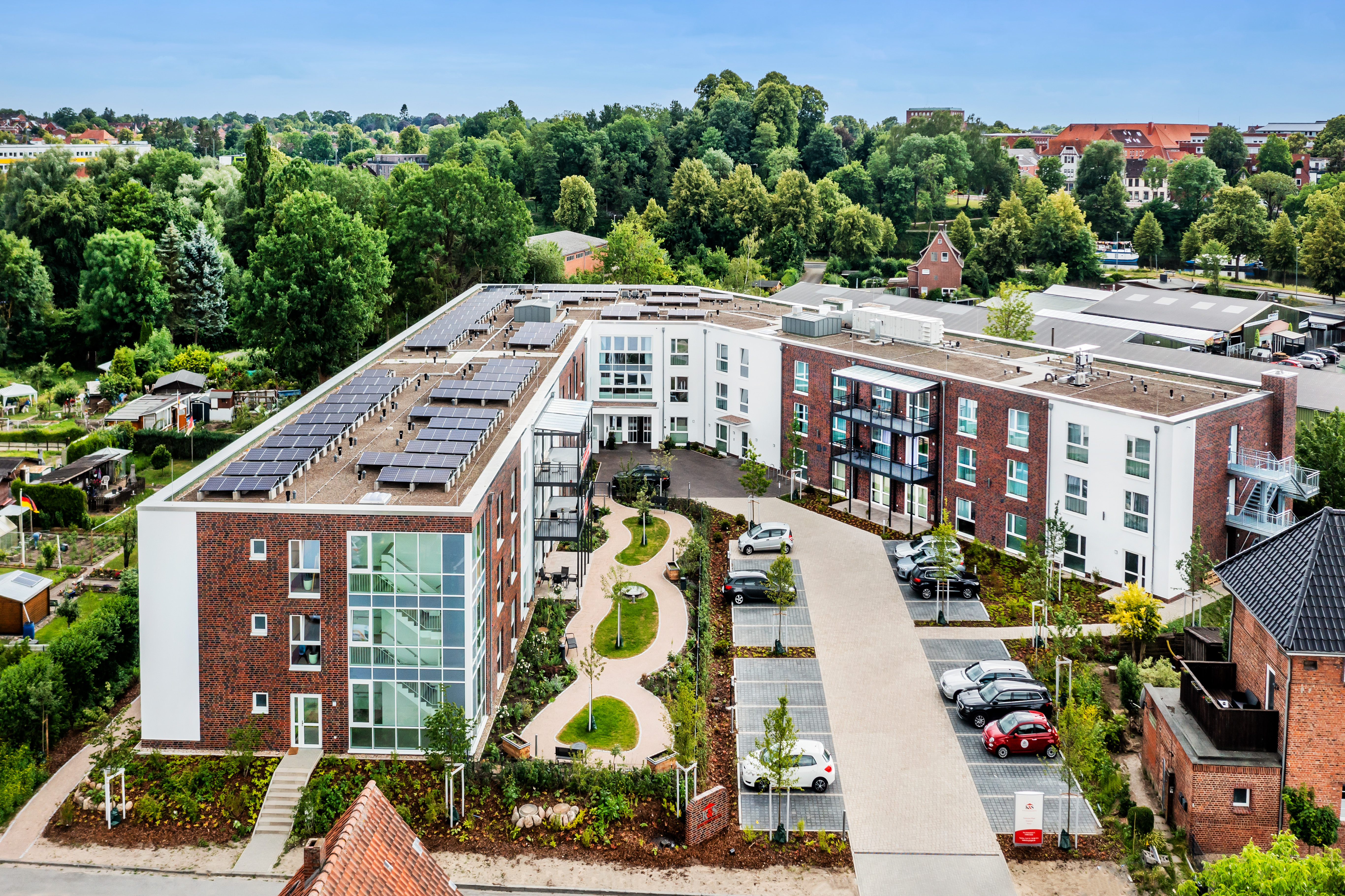 The care facility is close to the city centre and offers residents a high-quality and comfortable environment featuring a variety of cafes, restaurants, medical facilities and green spaces in the immediate vicinity. It was built in compliance with the KfW 40 standard and boasts excellent energy efficiency. A large section of the flat roof is equipped with a photovoltaic system. The innovative project was developed in cooperation with Madaster, which means that data on all materials and components used in the property are recorded in a register. That makes it possible to access information on the ease with which materials can be separated and reused as well as data on bound carbon emissions and material toxicity.