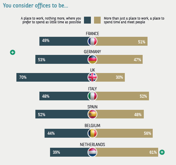Conversely, 70% of UK employees consider thatoffice the office is nothing more than a worplace, where as little time as possible should be spent - way ahead of Germany (53%) and Spain (52%), where the majority also share this view.