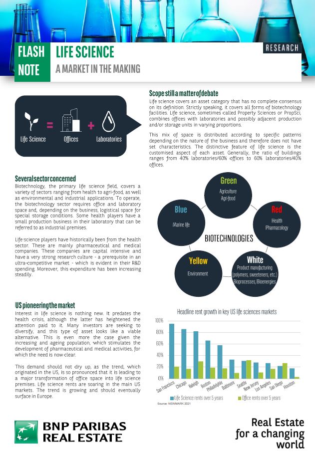 Sometimes called Property Sciences, or PropSci, Life Science combines offices with laboratory and possibly adjacent production and/or storage units in varying proportions. Originated in the US, the trend is growing up and should eventually face in Europe. The health crisis and the increasing and ageing population stimulates the development of pharmaceutical and medical activities. Life Science looks like an attractive asset and a viable alternative for investment.